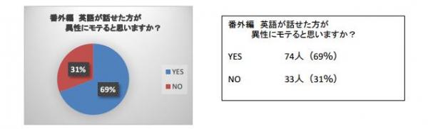 アンケートにお答え頂いた人の69%が英語が話せた方がモテると思うとの調査結果になりました。