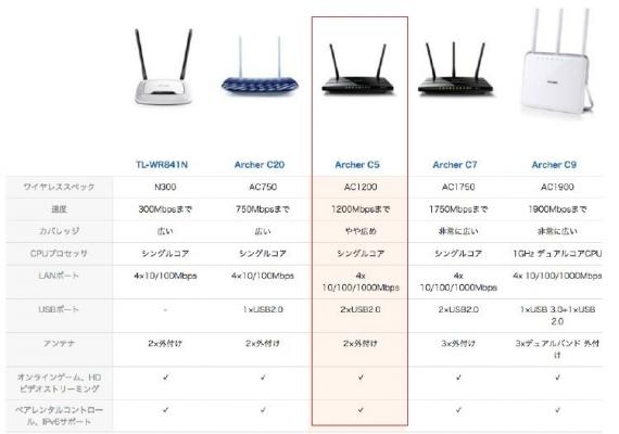 今回の「Archer C5」の姉妹機である各種無線LANルーターは、すでに日本国内販売されています。性能に関する比較は以下の表をご参照ください。