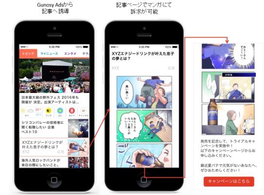 マンガを活用したマーケティングを企業向けに提供しているマンガマーケティングの株式会社シンフィールドは(本社:東京都中野区、代表取締役社長:谷口晋也)は累計 1,500 万ダウンロードを超える国内最大級の情報キュレーションアプリ「グノシー」を運営する株式会社Gunosy(本社:東京都港区、代表取締役 CEO:福島良典)と記事広告のメニューの1つとしてマンガコンテンツで商品やサービスを魅力的に訴求することができる「Gunosy Native Ads マンガ」を共同で開発し2016年9月2日より提供を開始しました。