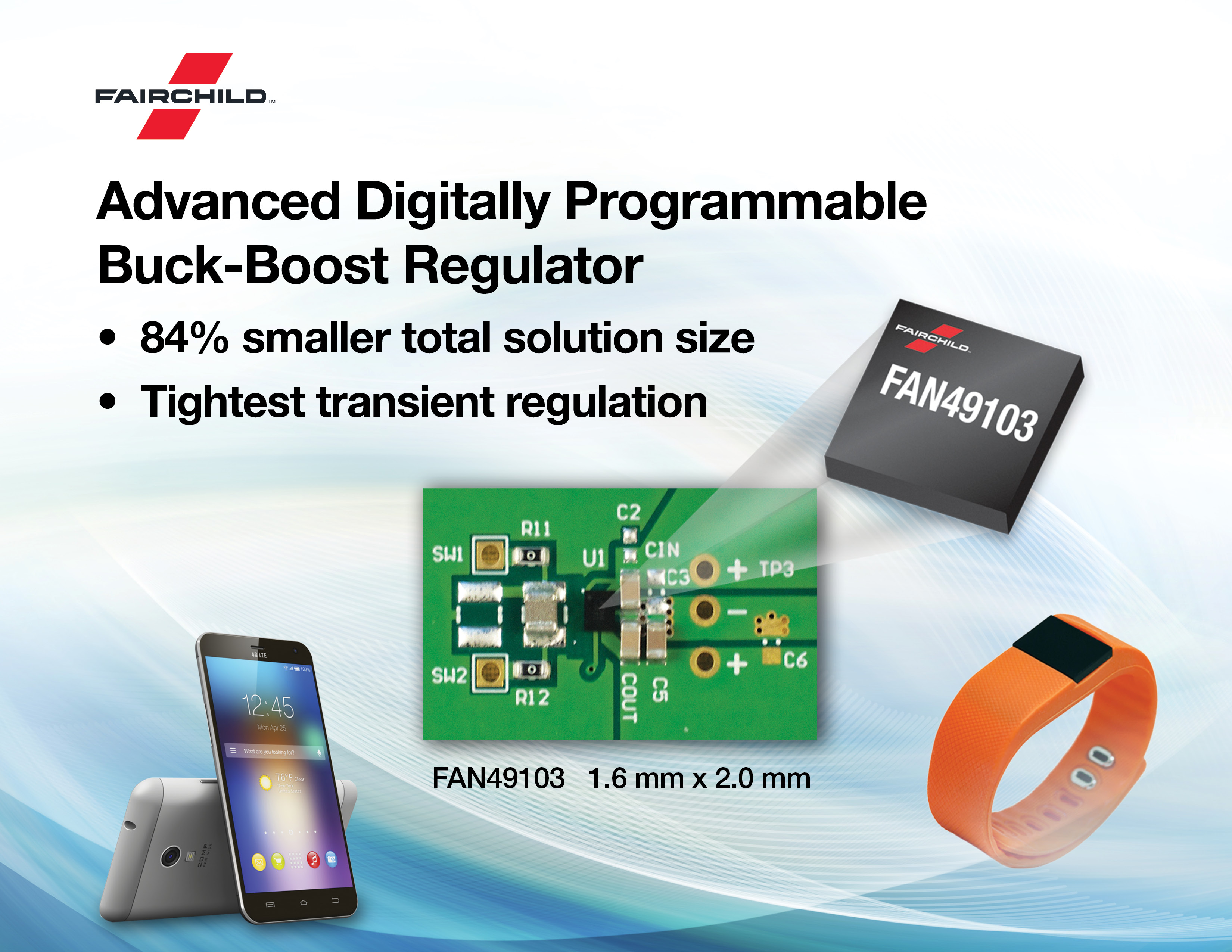 本日(2016年9月2日)、フェアチャイルドセミコンダクタージャパン株式会社(本社:東京都渋谷区、社長:神戸 肇、以下フェアチャイルド・ジャパンと略)は、スマートフォンやタブレット、その他バッテリーを電源とする民生向けモバイル機器用途に、デジタルでプログラム可能な最先端のバックブースト・レギュレーターの新製品「FAN49103」 https://www.fairchildsemi.co.jp/products/power-management/non-isolated-dc-dc/buck-boost-regulators/FAN49103.html?utm_source=press_release&utm_medium=PR&utm_term=&utm_content=link-FAN49103-pf&utm_campaign=mobile-pwr2016 を発表しました。これは、既に好評を得ている「FAN49100バックブースト・レギュレーター」ファミリーへの追加/拡充となります。「FAN49103」は最高の電力密度、最小の実装面積、負荷/ライン電圧の変動に対する優れた過渡応答特性、クラス最高のリップル性能、さらにこれらの組み合わせをもって、上記機器の電源において不可欠な要件を満たします。