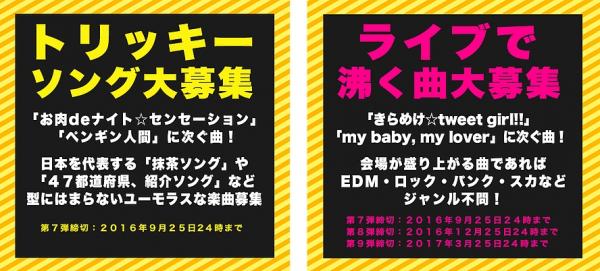 日本を代表するような「抹茶ソング」「都道府県紹介ソング」など、型にはまらないユーモラスな楽曲をお待ちしております。