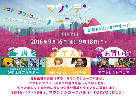 登山・アウトドア用品販売とクライミングジム運営を展開する株式会社好日山荘(本社:兵庫県神戸市)は9月16日(金)から9月18日(日)まで、新宿NSビル(東京都新宿区)においてアウトドアファンのためのイベント「マウンテンカーニバル in TOKYO」を開催いたします。