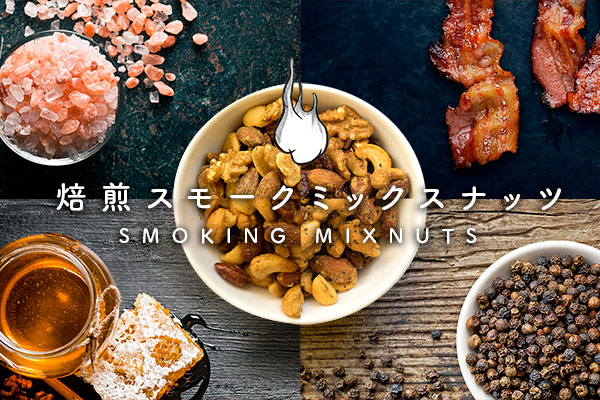 【燻製スモークミックスナッツ】は、ドライフルーツ、ナッツ専門店の小島屋が、より深く「美味しい」を追求して開発したスモークナッツです。