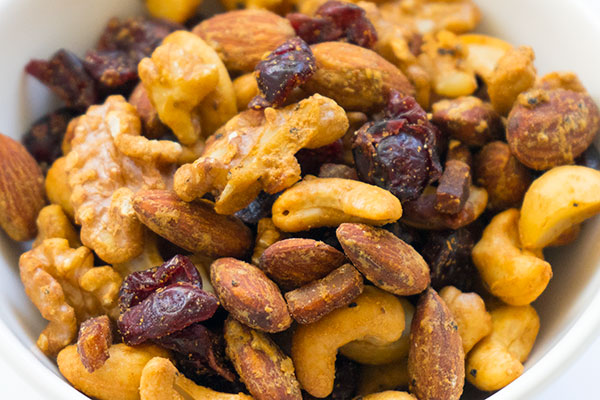カシューナッツ(インド)・アーモンド・くるみ(アメリカ)・マカダミアナッツ(オーストラリア)・クランベリー(アメリカ)・卵白・黒胡椒・オリーブオイル・食塩・スモークフレーバー(原材料の一部に大豆含む)