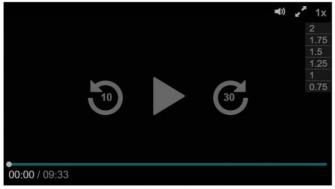 写真左)画面上の右側には30秒進むタッチパネル、左側には10秒戻るタッチパネルを配置し、効率よい学びを実現できる仕組みとなっています。写真右)動画再生の画面上のレイヤーとなります。画面右上には倍速再生が仕組まれています。