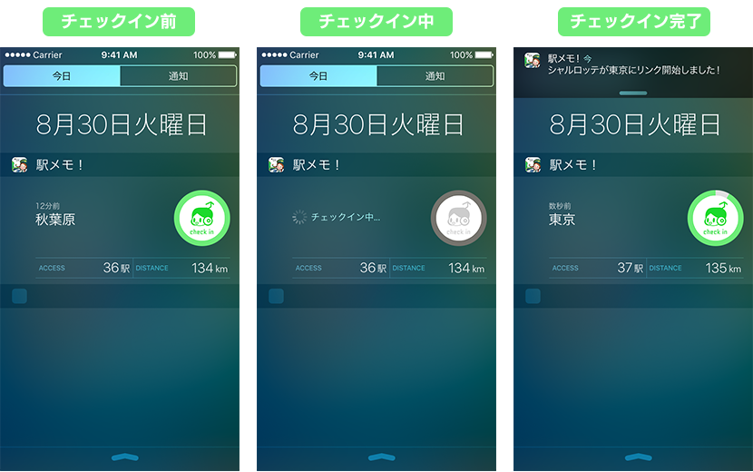 「通知センター」を表示させ、画面上部の「今日」のタブをタップすることにより、「駅メモ!」のウィジェット機能の右側に表示される「チェックイン(check in)」ボタンをタップできるようになります。同画面にて、ユーザーのプレイデータの一部を閲覧できます。