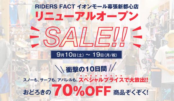 ムラサキスポーツがプロデュースするアクションスポーツギアーの旗艦店「RIDERS FACT(ライダーズファクト)幕張新都心店」が、イオンモール幕張新都心グランドモール3階にリニューアルオープンすることを記念して、特別セールを実施します。セールは2016年9月10日より開始し、スノーボード、サーフィン等のギアーを中心に、有名ブランドの商品を特別価格にて販売します。70%OFFを超える商品を含む多数のセール商品を取り揃え、アクションスポーツを愛する多くの人々に喜んでいただけるセールを開催します。