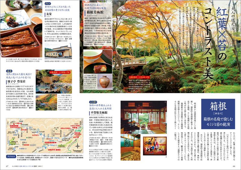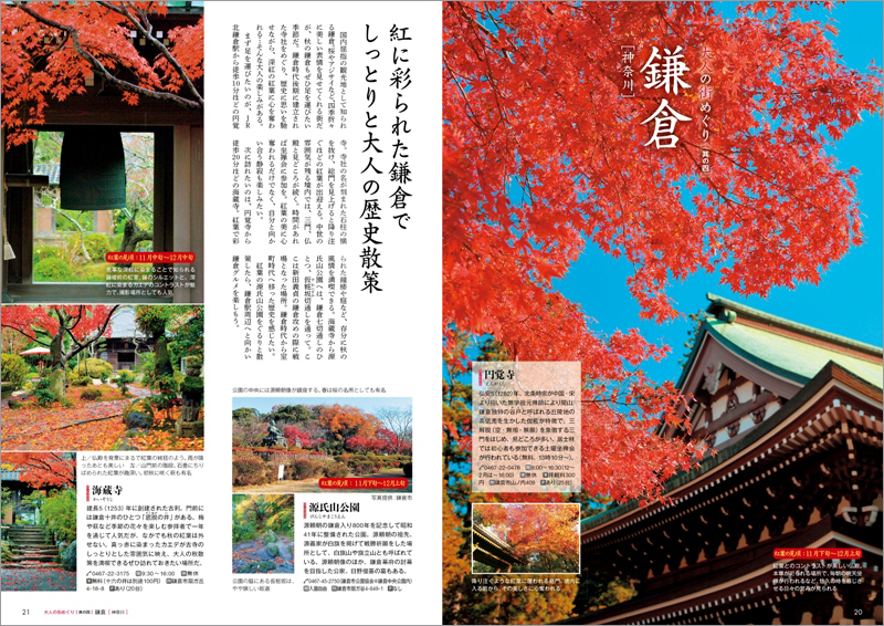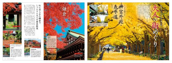 今回の「大人の街めぐり」では、<秋冬ならではの街の顔を探しに>というテーマで紅葉、建築美、アートなど街歩きそのものが楽しめるエリアとして、イチョウ並木+美術館の集まる神宮外苑・表参道、紅葉に映える社寺建築+世界遺産国立西洋美術館がある上野、椿山荘の紅葉+貴重な建築の多い目白・音羽、ほか駒込、深大寺、丸の内(以上東京)、鎌倉、横浜、川越、大宮、成田山を収録。