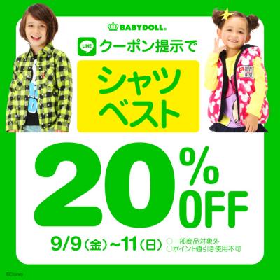 BABYDOLL LINE@友だちを対象に、シャツ&ベストが20%OFFになるお得なLINEクーポンをプレゼントします。ロングシーズン使えるアイテムがお得にお買い物できるチャンスです!