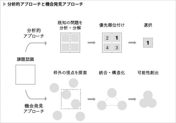 商品開発やマーケティング、新規事業などで一般的に使われているのは、既にある問題を分析して、どこから着手するかの優先順位付けを行い、選択する「分析的アプローチ」です。