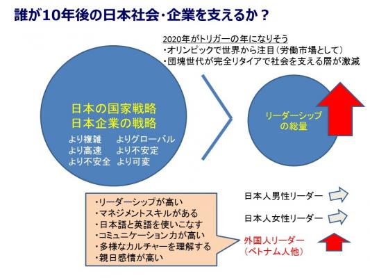 今後、日本国内は労働者人口の減少と共に、リーダーの不足またはリーダーシップの総量の減少という事態に直面し、外国人をリーダーとして登用する機会も益々増加するものと思われます。こうした大きなビジネス環境の変化の中、ベトナムと日本は国家間・企業間の関係も極めて良好であり、高い志をもって日本語を学ぶベトナム人も多くいることから、今回のベトナム進出を決定しました。