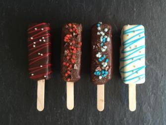 グラノーラとチョコレートを混ぜ合わせてクランチ状に仕上げたものに、チョコレートをディップして、さらにデコレーションを施しました。