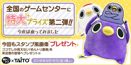 大好評だった第1弾に続き、特大ぬいぐるみがまたまた登場します!タイトーステーション限定プライズであった前回より、今回は取り扱い店舗を大幅拡大し全国のゲームセンターでの展開となります。さらに5月に行ったtwitterキャンペーンの達成を記念して小数量でレアめんトリ「めんツル」 も降臨します!