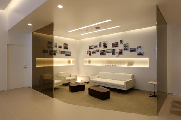 ショールームのデザインは最新のマセラティCIを全て導入。洗練された白を基調に、ラグジュアリースポーツブランドにふさわしいエレガントさ、広々とした空間を提供。大きなガラス張りのスペースが、明るい開放感とくつろぎを演出します。