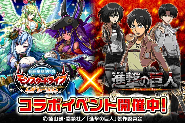 株式会社ICJ(本社:東京都渋谷区、代表取締役:ホー・トゥン・ラム、 http://icj.jp/ 、以下 ICJ)は、スマートフォン向けゲームアプリ「モンスター ドライブ レボリューション (モンドラ)」において、2016年9月16日(金)より、人気アニメ作品『進撃の巨人』とのコラボイベントを開始したことを発表致します。