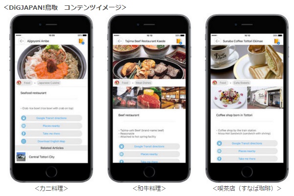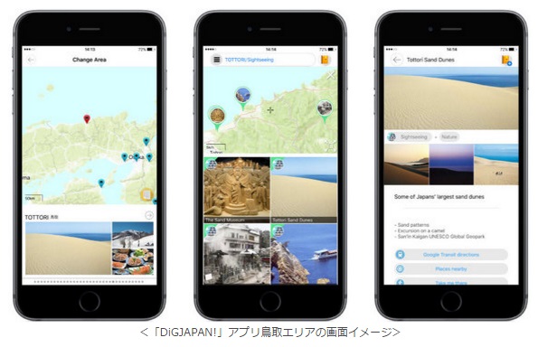 株式会社昭文社(本社:千代田区麹町、代表取締役社長 黒田茂夫、東証コード:9475)は、鳥取県鳥取市、岩美町、若桜町、智頭町、八頭町、兵庫県香美町、新温泉町とのコラボにより、訪日外国人観光客向けの無料の日本観光アプリ「DiGJAPAN!」に、訪日客に人気の鳥取砂丘やカニ、和牛、アニメ聖地巡礼など観光資源豊富な鳥取エリアを、2016年9月30日より新たに追加します。