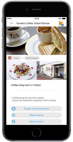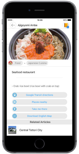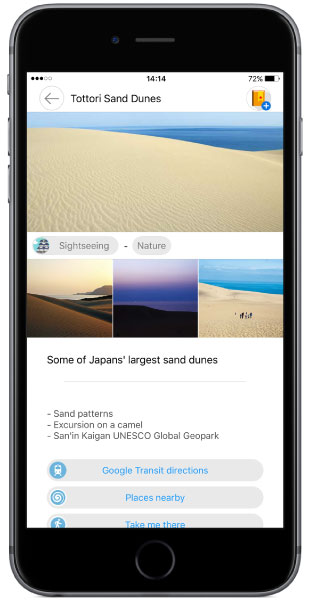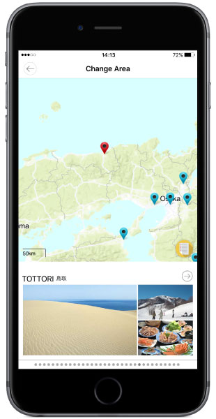 今回、「DiGJAPAN!」アプリの新しいエリアとして追加された鳥取では、鳥取県鳥取市を中心に、岩美町、若桜町、智頭町、八頭町、兵庫県香美町、新温泉町の観光スポットやグルメをご紹介しています。当エリアは、国際的な観光都市・大阪からの移動時間も2時間半ほどで、大阪や京都を基点とした周遊ルートに組み込みやすいという特長があります。