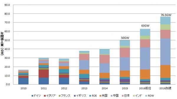 2016年は、インドでの市場成長が期待されるとともに、ASEAN諸国、中東、アフリカ、中南米市場の拡大も期待されます。太陽光発電のコストが下がったことで、中東や中南米では太陽光発電所の入札において3米セント/kWhの電力取引価格(PPA)も報告されるようになり、太陽光発電プロジェクトが発展途上国各地で報告されるようになりました。こうした国々においては、資金調達や行政手続きの複雑さなどの障壁もありますが、COP21に際して世界の開発銀行がクリーンエネルギー普及への投資を公約したことで、資金調達環境は大きく改善されています。2016年上期には、中国において22.5GWが導入されたとの報道がありました。7月からのフィードイン・タリフ(FIT)の変更を前に大きな駆け込み設置が生じた結果です。中国の導入量によって大きく見通しは変動しますが、低位ケースでも通年での導入量が60GW台となる可能性もでています。