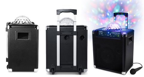Block Party Liveは、スピーカーにLEDミラーボールが付いたインパクト抜群の外見を持つ、充電池内蔵のポータブルPAシステムです。