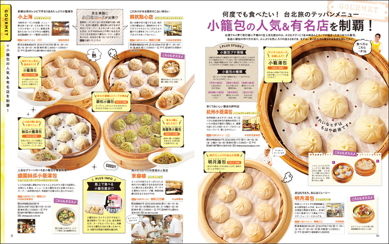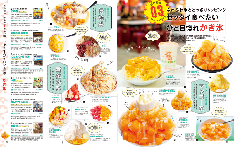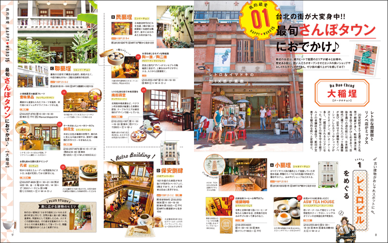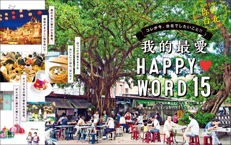 巻頭特集では、「我的最愛 HAPPY WORD15」と題して、台北で今注目のまち歩きや、グルメ、体験など15テーマのくくりでご紹介。リノベーション(改装による建物再生)が大流行の台北で今最も人気のある街や、以前より大人気の小籠包やかき氷の注目店、モーニングツアー体験、絶景めぐりなど、定番の最新情報から人気急上昇中のジャンルまで幅広くカバーしています。