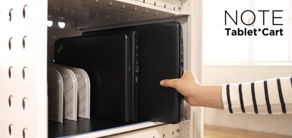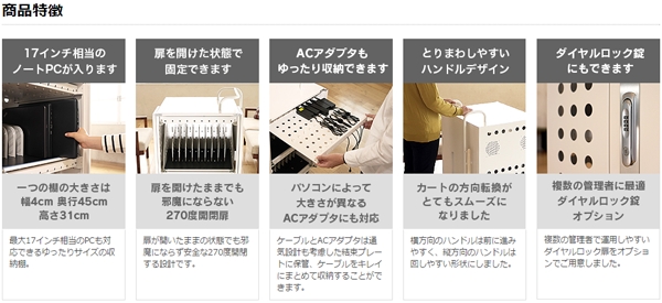 また、企業研修やペーパーレス会議で使用する大型ノートPCやフリーアドレス・レイアウトのオフィスでの業務PCや出張用の貸出式PCなどの充電/保管/管理に最適です。