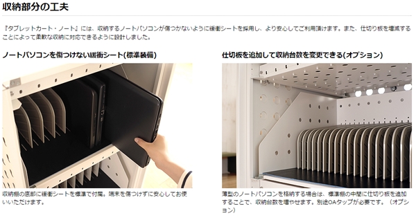 『タブレットカート・ノート』には、収納するノートパソコンが傷つかないように緩衝シートを採用しました。また、仕切り板を増減することによって柔軟な収納に対応できるように設計しています。