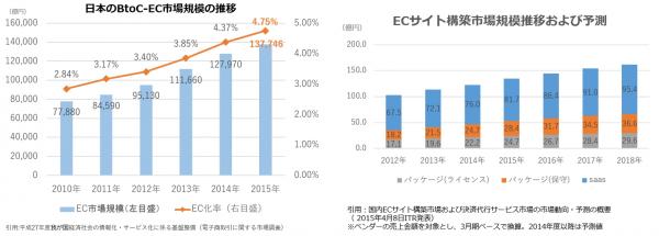 EC業界の市場規模は年々拡大しており、平成27年度の日本国内のBtoC-EC市場規模は、13.8兆円まで拡大し、全ての商取引金額(商取引市場規模)に対する、電子商取引市場規模(EC化率)も年々向上しています。(下記図参照)