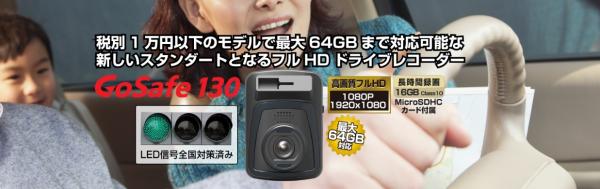 「GoSafe 130」は税別1万円以下のモデルで最大64GBまで対応可能な新しいスタンダードとなる300万画素フルHD高画質ドライブレコーダーです。標準でメモリーカード16GBを付属し、長時間記録可能な最大64GB対応したモデルです。HDR機能を搭載し明暗差のある映像の白とび黒つぶれを低減した鮮明な映像を記録します。