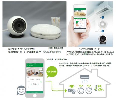 ビデオログサービス「VLOG(ブイログ)・サービス」は、(1)インテリア性にも優れたコンパクトなクラウドカメラ「VLOG CAM」、(2)スマホで簡単にライブ映像の閲覧や自動録画、顔認識などの映像解析ができるクラウド型ビデオログ「VLOG(ブイログ)」、(3)部屋の温湿度や空気の状態を確認したり、エアコン操作ができる家電コントローラー内蔵環境センサー「bPoint COMFORT」(将来的には他の家電製品のリモコンとしても機能拡張を予定)の3つで構成される、設置も簡単、かつ高性能でコストパフォーマンスに優れたサービスです。