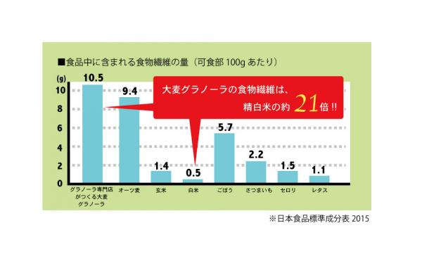 大麦グラノーラの食物繊維は、なんと精白米の約21倍。まずは1週間、ぜひ朝食で食べて、続けてみて、大麦のチカラを実感して下さい。