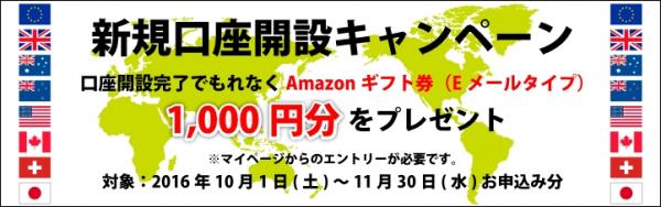 FX取引サービス「MT4・ZERO」を提供する外為ファイネスト株式会社(本社:東京都千代田区、代表取締役:石野由美子)は、2016年10月1日より、口座開設完了で「Amazonギフト券(Eメールタイプ)1,000円分」をもれなくプレゼントする『新規口座開設キャンペーン』を開催中です。