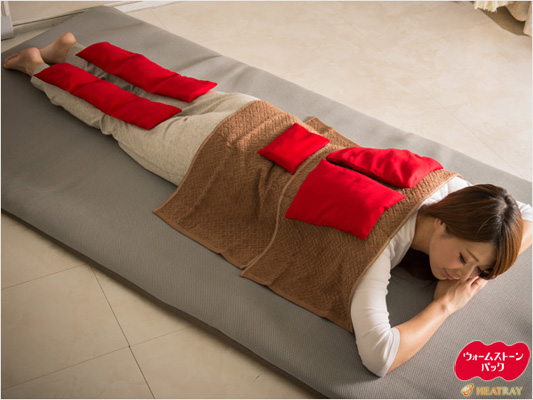 HEATRAY『ウォームストーンパック』は、遠赤外線を放射する天然鉱石を、体にフィットする大きさ・形状にして、専用の二重構造の耐熱袋に封入したホットパックです。