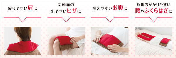 ◇じんわり心地よい温かさを、凝りやすい肩や、関節痛の出やすい腰やヒザ、