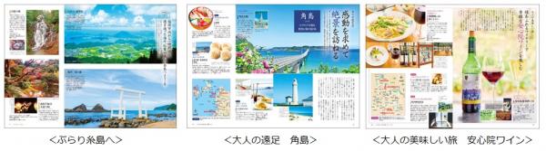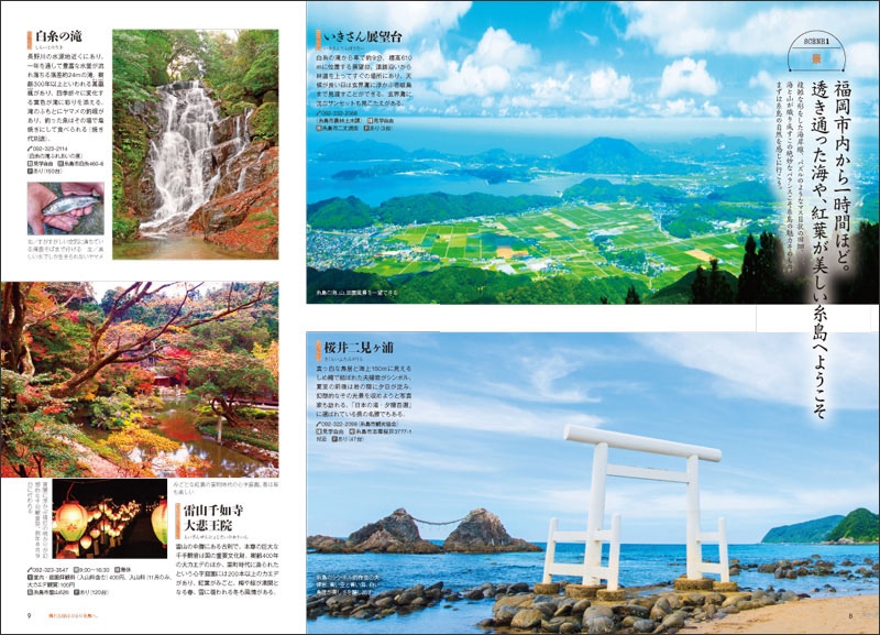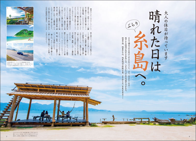 巻頭では、福岡市内から車で30分ほどで海山の絶景やグルメ、オシャレなハンドメイド雑貨と出合える、今最も人気のある日帰りスポット糸島にフォーカス。