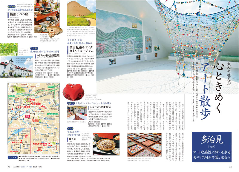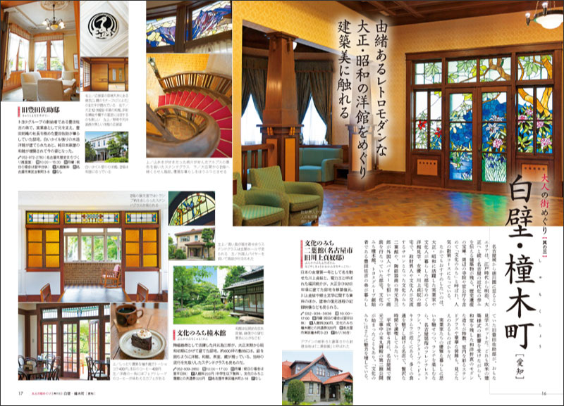「大人の街めぐり」では、2027年のリニア中央新幹線開通が追い風となり注目の集まる名駅周辺や、ステンドグラスの美しい洋館を巡る白壁・橦木町(しゅもくちょう)、建築家・伊東豊雄氏の手がけた図書館が話題の岐阜などを収録。
