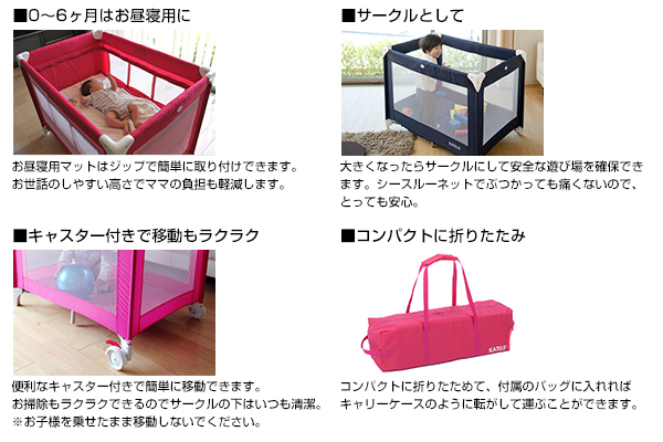 KATOJIの「プレイヤード」は、新生児期はお昼寝に、大きくなったらサークルにと成長に合わせて長く使うことができます。付属のお昼寝マットを使えばママがお世話のしやすい高さに。シースルーネットでできているので、万が一お子様がぶつかってしまっても安心です。また、移動に便利なキャスターが付いているため家の中での移動はもちろん、コンパクトに折りたたんで、付属の収納バックに入れれば転がして運ぶことも可能。いつでもどこでも簡単に持ち運んでお子様の居場所がつくれます。
