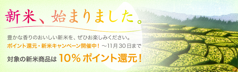 秋は、ごはんがおいしい季節。この時期ならではのおいしい新米を、ぜひ召し上がっていただきたく、新米をご購入時に新米購入価格の10%をポイント還元(付与)する「新米キャンペーン」を開催。
