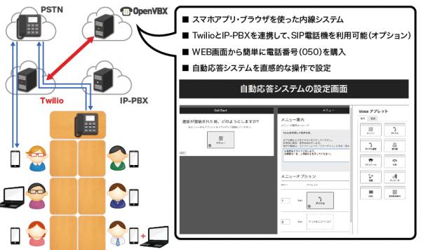 ユーザーによるコールフローの即時カスタマイズに対応したOpenVBX( http://www.openvbx.org/ )システムを多言語化し、日本国内でも使いやすいインターフェイスを備えたクラウドシステムと、スマートフォン(iOS/Android)向け内線電話アプリケーションを組み合わせた構成となっており、オプションで据え置き型VoIP電話機にも対応する。