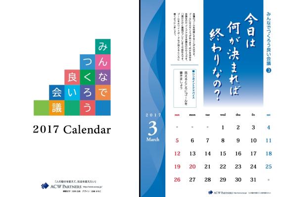 (株)ACWパートナーズ(東京都千代田区、代表 大國 仁、電話03-5219-1443、http://acwp.jp)は、会議の効率化に活用できる壁掛けカレンダーを2016年11月1日に発売します。本カレンダーには、会議を一歩一歩改善していくためのテーマが毎月設定されており、会議室に貼っておくことで会議の改善への意識向上や行動の変化を促すことができます。