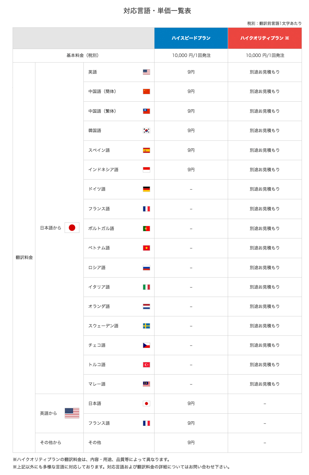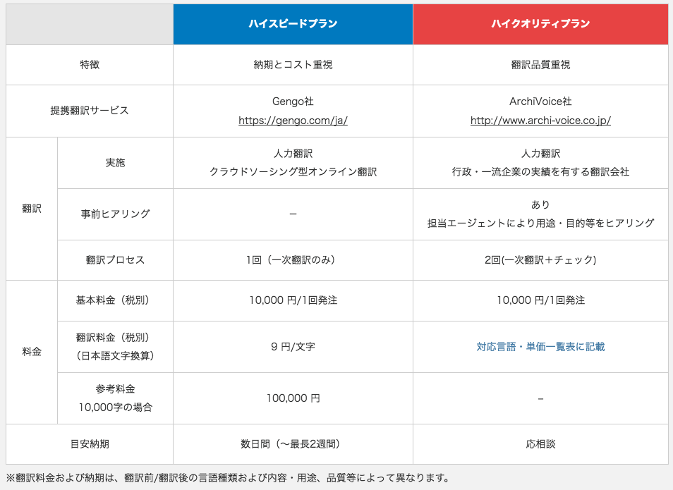 ユーザーは、翻訳品質を重視した「ハイクオリティプラン」(アーキヴォイス社)と、コストとスピードを重視した「ハイスピードプラン」(Gengo社)のふたつのプランから、用途に応じて選択できます。また、現時点で12の言語に対応している上に(ハイクオリティプランにて、日本語からの場合)、翻訳は機械翻訳ではなく全て人力で行われるため、専門用語を含む場合なども、臨機応変に対応が可能です。