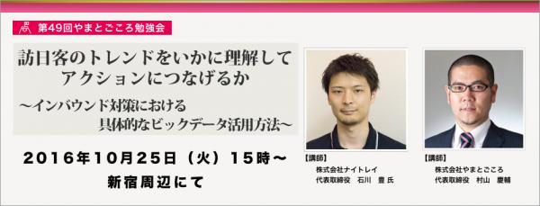 日本最大のインバウンド(訪日外国人観光)業界向けB to Bポータルサイト「やまとごころ.jp」(http://www.yamatogokoro.jp/)を運営する株式会社やまとごころ(代表取締役:村山慶輔、本社:東京都新宿区、以下 やまとごころ)は、インバウンド業界におけるビッグデータの活用手法をテーマとしたセミナーを、2016年10月25日(火)に開催いたします。