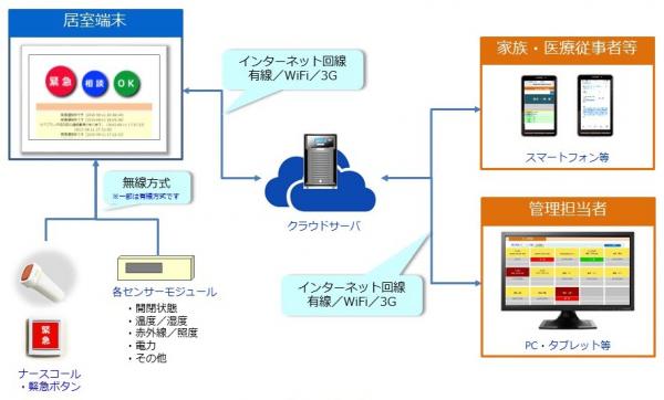 本システムは緊急コール機能、温度・湿度、開閉センサ、電力等による日常生活・安否確認機能、インターネット技術を用いたコミュニケーション機能を有しています。システムはクラウドサーバとインターネット接続された端末装置及び、各種センサから構成されます。各センサは電源用の電池を必要としないため、電池消耗状況の管理や交換のための保守業務を必要としません。また、各センサと端末装置間の情報伝送は無線方式であるため配線工事がいらないことから、既設の住居等に容易に設置することができます。本システムは居室内及び周辺の情報をIoT技術で収集しクラウドサーバで管理運用する次世代型の見守りシステムです。