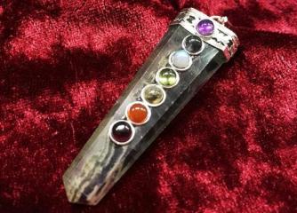 フローライトの蛍刃に7色のパワーストーンが配置された、魅力的な現代版黒魔術宝珠。ペンダントトップにもお使いいただけます。