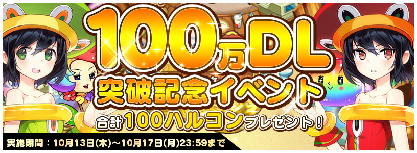 キャンペーン期間中、100万ダウンロード突破を記念して、ハルコン購入時に付与されるハルコンボーナスが20%アップいたします。