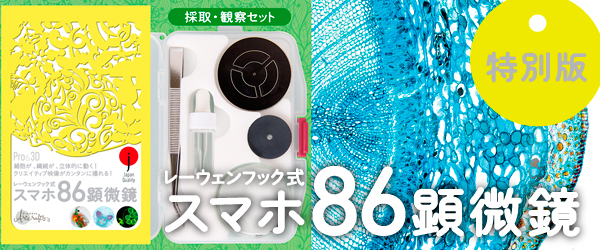 「特別版」は、従来のセット(照明コントロールボード、ディフューザー、小型シャーレ、ピンセット、円型スライドガラス ほか)に、86用ボールレンズ+1個と植物細胞・微生物写真ポストカード12枚が付いて同額価格の3,200円(税抜)。