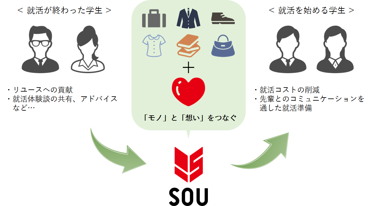 就職活動におけるコストは、交通費をはじめリクルートスーツやバッグ、就活対策本など、意外と大きく膨らむものです。その中には就活を終えた後、使用しなくなるものも少なくありません。当社は「買って使う」から「売ってつなぐ」リユースの魅力と可能性を伝える企業として、就活を終えた学生と就活を始める学生が共に集い、リユースを通してコミュニケーションのとれる場を提供しようと考え、今回の就活フリマの開催を決定いたしました。