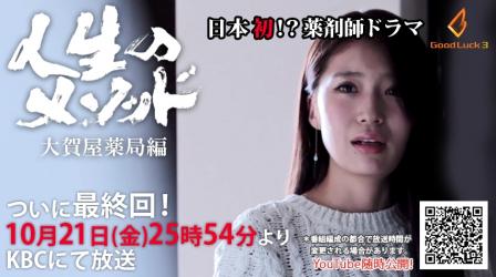 株式会社大賀薬局(本社:福岡県福岡市、代表取締役社長:大賀研一、以下「大賀薬局」)と株式会社グッドラックスリー(本社:福岡県福岡市、代表取締役CEO:井上和久、以下「グッドラックスリー」)は、共同制作した日本初!?薬剤師ドラマ『人生のメソッド~大賀屋薬局編~』最終話を、KBC九州朝日放送(以下、KBC)にて、明日10月21日(金)深夜25:54より放送開始します。また、最終話の放送を前に、プロデューサーの大賀崇浩氏と、監督/脚本/主演を務める三天屋多嘉雄氏のコメントをグッドラックスリー公式サイト上に本日20日(木)18:00に公開することをお知らせいたします。