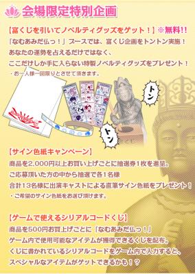 また当日グッズを500円以上お買い上げごとにゲーム内で使える「シリアルコードくじ企画」、2,000円以上お買い上げごとに「サイン色紙プレゼントキャンペーン企画」応募券を進呈致します。「なむあみだ仏っ!」ブースのリアル富くじで貴方もリアルトントンしてみませんか?
