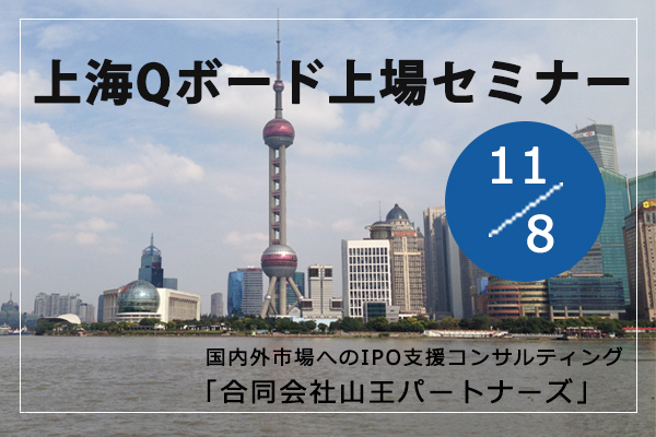 合同会社山王パートナーズ本社で開催する『上海Qボード上場セミナー』は、起業間もないスタートアップ企業~中国マーッケトを狙う企業向けに、上場プロジェクトの概要と上海株式上場の魅力を説明する。また、日本マーケットではなく最初から中国マーケット向けに中国で起業したいと考えているアントレプレナーにもお勧めである。