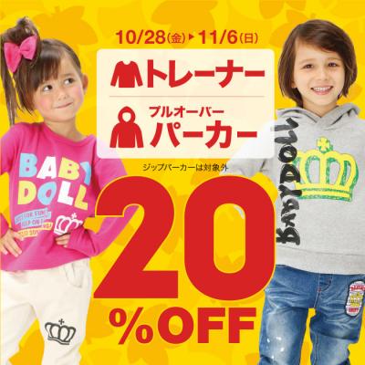 株式会社コージィコーポレーションが運営するベビー・キッズ服ブランドBABYDOLL(ベビードール)が、BABYDOLL(ベビードール)・STARVATIONS(スターベイションズ)各店、通販各店にて、秋冬マストアイテムのトレーナーとプルオーバーパーカーを対象に、10日間限定で20%OFFにて提供します。